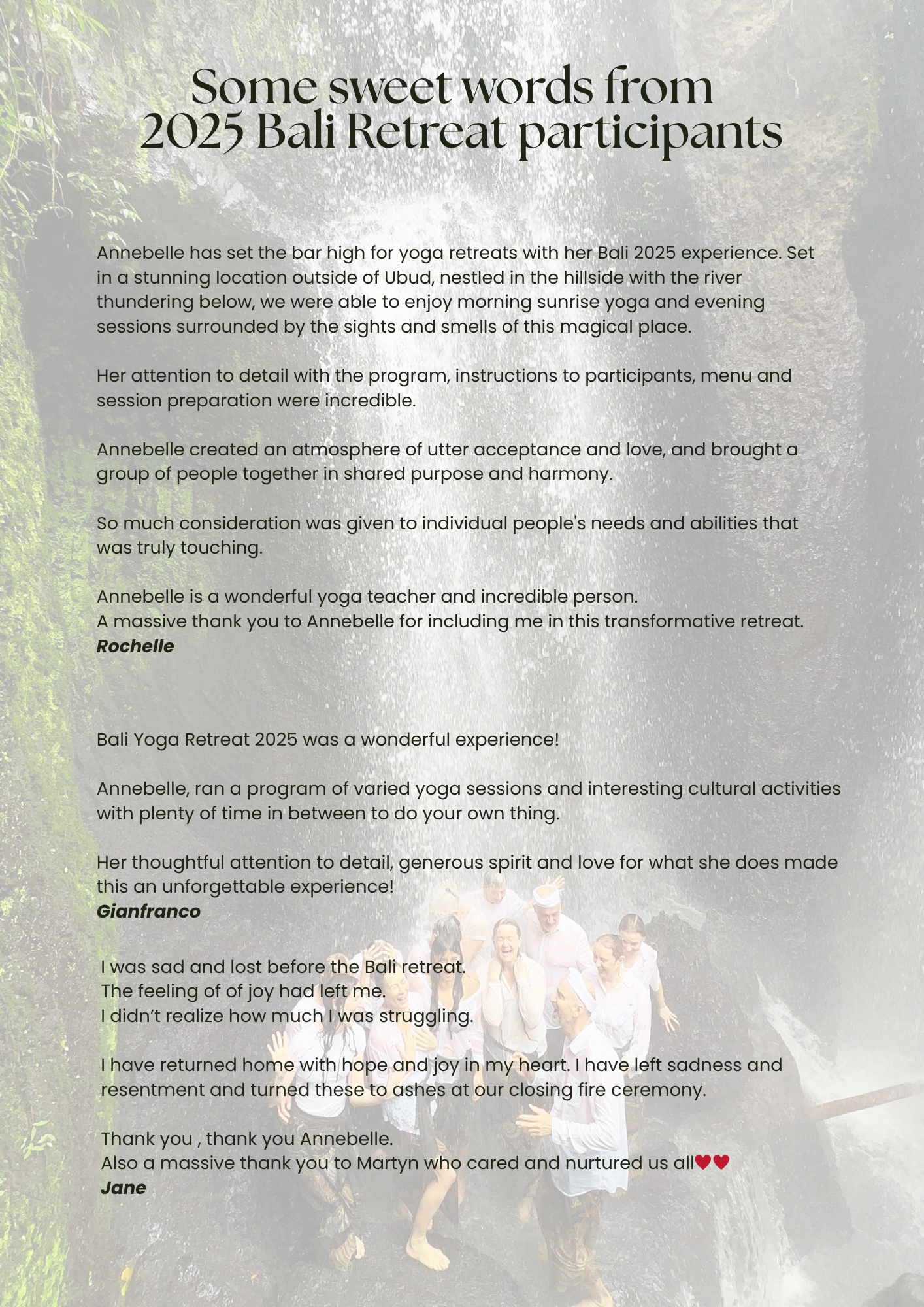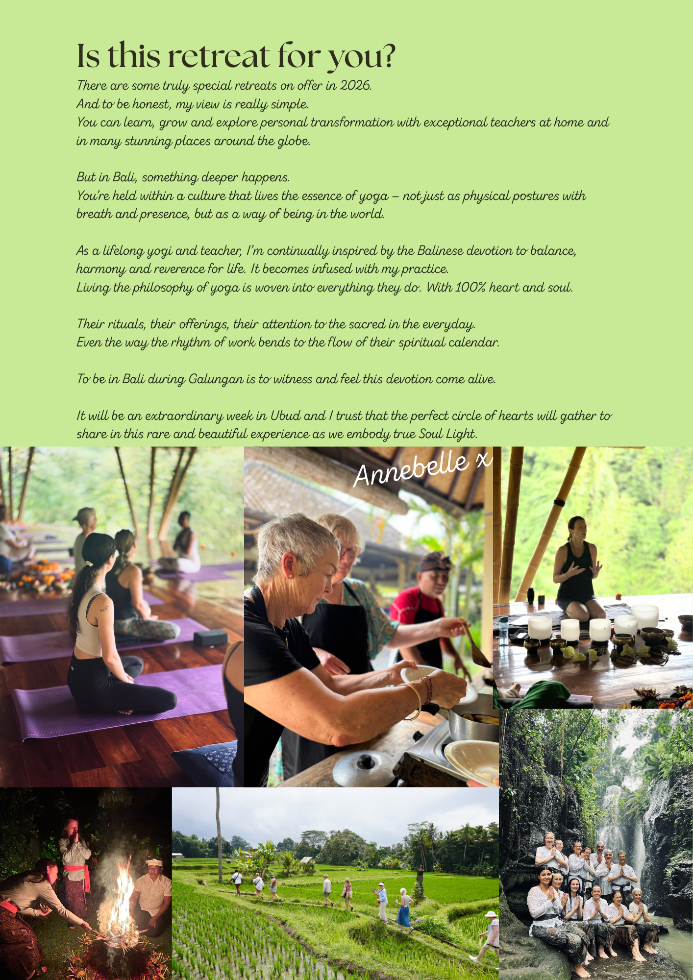 There will be photos taken of the retreat groups to use for marketing so please be sure to tell Annebelle if you do not consent to this.