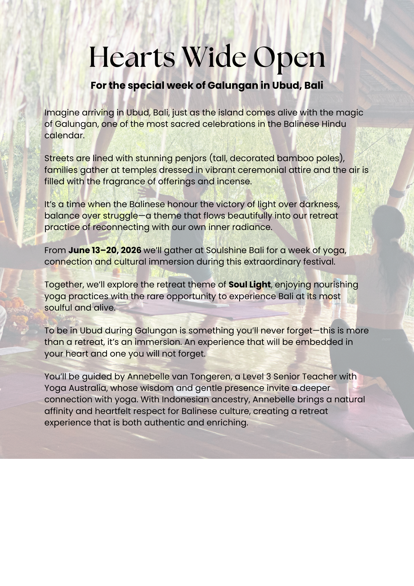 Previous participants have stated that arriving in Bali a day ahead of the retreat gave them a chance to land and catch their breath. This may be helpful when planning your travel.